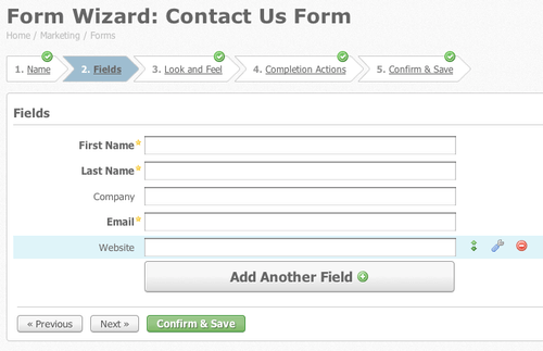 Pardot uses a “wizard” interface in its form builder. This setup assistants presents users with a sequence of dialog boxes that lead them through a series of predefined steps. Users can choose and edit form fields, preview and save completed forms for use on landing pages.