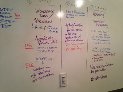 Development constraints limited how far we could redesign the form builder’s interface, but we wanted to see to what extent this was true. To get this information we began by designing two different form builder interfaces. Kendra developed a wizard like interface with real time previews and feedback. My changes were more conservative with a focus on improving information hierarchy, iconography and ontology.